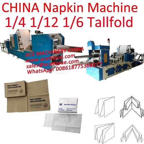 Tipos de métodos de plegado de las servilletas: 1/4 de pliegue mecánico, 1/8 de adsorción al vacío, 1/4 o 1/6 de pliegue de dispensador, 1/6 de servilleta de pliegue alto, 1/12 de pliegue, etc. U otros métodos de plegado, como la servilleta no tejida o la servilleta de aire que tiene un bolsillo para poner el cuchillo y el tenedor, se pueden personalizar. Como fabricante líder de máquinas para fabricar servilletas en China, ACE MACHINERY CHINA puede proporcionar varias máquinas para fabricar servilletas personalizadas.